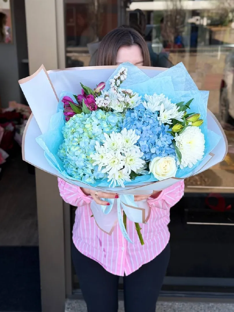 Blue Touch is a blue flower bouquet in Edmonton created for customers looking for a fresh, affordable, and modern floral option. This arrangement combines blue tones with hydrangeas, carnations, and roses to create a balanced and visually clean bouquet.